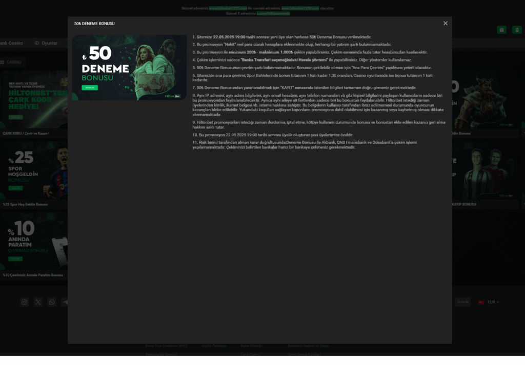1. Sitemize 22.05.2025 19:00 tarihi sonrası yeni üye olan herkese Hiltonbet 50₺ Deneme Bonusu verilmektedir.